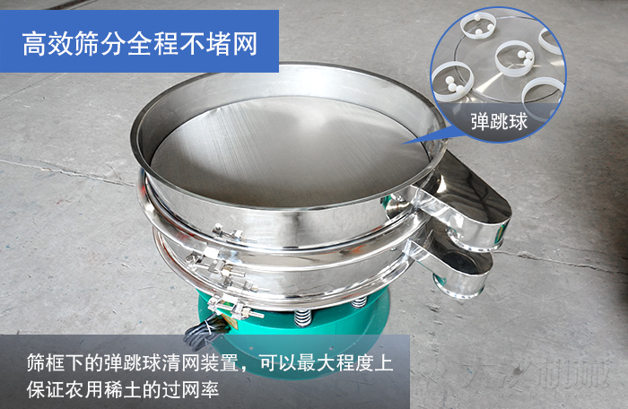 圓形振動篩通過振動電機(jī)上兩端的偏心塊將篩機(jī)運(yùn)動轉(zhuǎn)化為三元運(yùn)動對農(nóng)用稀土進(jìn)行高效篩分,再加上篩框下的彈跳球清網(wǎng)裝置,可以很大程度上保證農(nóng)用稀土的過網(wǎng)率,高效篩分全程不堵網(wǎng)。